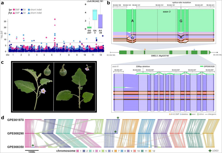基于PG-SM泛基因组变异信息,对叶片和花萼刺性进行 Pan-GWA分析,在6号染色体定位到主效QTL并锁定LOG3基因。研究表明,无刺表型主要原因是其第三外显子末端剪接位点SNP(A>G),此外,栽培种GPE003520的LOG3第6外显子226 bp缺失,及野生种GPE008350含LOG3的22 Mb区段易位至1号染色体异染色质区,均导致基因功能异常。
