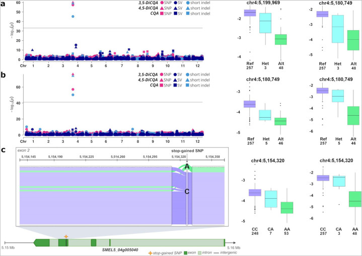 最后,研究对果实绿原酸及其衍生物含量进行测定,通过Pan-GWA分析,在4号染色体定位到主效QTL。进一步挖掘发现,该区间内的 GDSL-like酯酶/脂肪酶基因存在突变,导致其编码的蛋白功能失效,最终显著降低了果实中相关代谢物的积累。这一发现明确了该基因在茄子绿原酸衍生物合成中的核心作用。