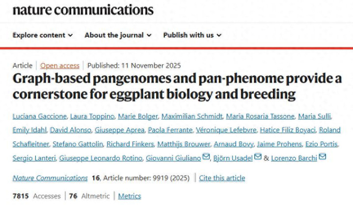 2025年11月,意大利都灵大学植物遗传专业的L.Barchi等人在Nature Communications发表了题为Graph-based pangenomes and pan-phenome provide a cornerstone for eggplant biology and breeding的文章,研究通过整合基因组学、群体遗传学和表型组学,构建了迄今最全面的茄子遗传资源体系,揭示了茄子进化历史、种群结构及重要农艺性状的遗传基础,为茄子精准育种提供了关键资源与策略。